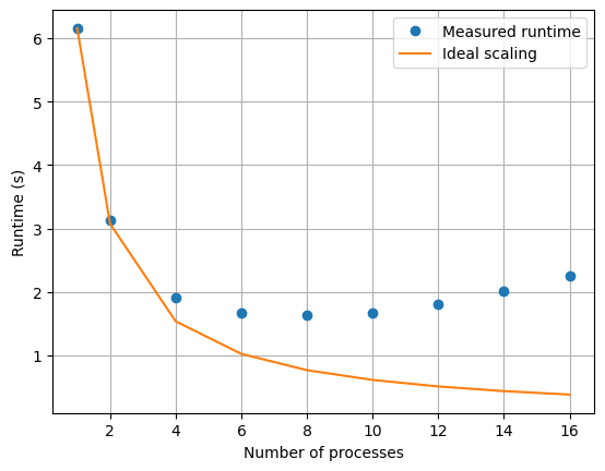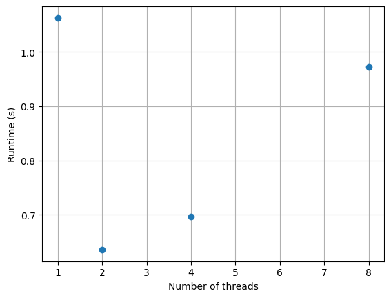 import matplotlib.pyplot as pltplt.plot(Ps, runtimes, 'o')plt.xlabel('Number of threads')plt.ylabel('Runtime (s)')plt.grid(True)plt.show()