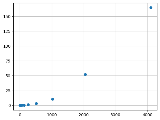 import matplotlib.pyplot as pltplt.plot(Ns, runtimes, 'o')plt.grid(True)plt.show()